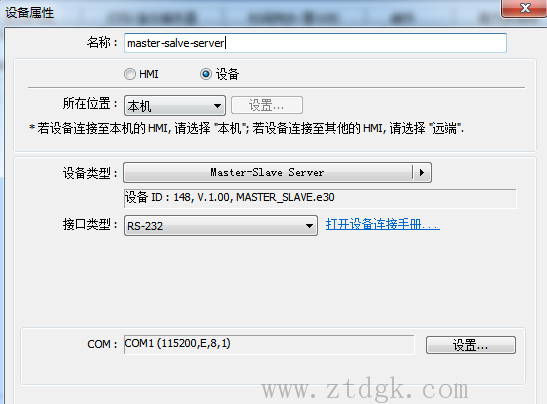 位置选远端)设置(选串行端口)、设备类型(与主屏设置第一步